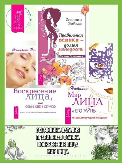 Правильная осанка – долгая молодость. Система ОсьмионикаОсанка – основа основ хорошего самочувствия и внешнего вида. Красивый цвет лица, отсутствие второго подбородка и мешков под глазами, четкий овал без «брылей» – зависят от состояния шеи, кровоснабжения тканей лица, свободного тока лимфы. Ровные, стройные ноги, здоровая поясница, пропорциональная фигура, легкость дыхания, даже артериальное давление – на все влияет статика тела и его положение в пространстве. Из книги Наталии Осьмининой, биоинженера, создателя уникальных методик по омоложению лица и тела вы узнаете, как продлить естественную молодость благодаря правильной осанке. Для практической работы с телом в книге представлен разработанный автором комплекс «Система Осьмионика». В нем даны эффективные приемы и техники, с помощью которых вы сможете выстроить физиологичную осанку; раскрыть грудной отдел и убрать сутулость; поработать с мягкими тканями, чтобы уменьшить жировые отложения и сформировать талию; избавиться от напряжения в пояснице; исправить кривизну ног и выровнять ассиметрию таза; убрать причину вздутия живота; вернуть шейному отделу правильное положение и тем самым улучшить кровоснабжение лица и тонус кожи. Весь материал, который дает автор, проиллюстрирован, поэтому разобраться в теме и освоить методику будет под силу даже людям, не имеющим специальной подготовки.Воскресение лица, или Обыкновенное чудо. Теория и практика восстановления молодостиЯ приглашаю вас в увлекательнейшее путешествие в Мир лица, находящийся под кожей, и надеюсь, что он станет для вас откровением. Приоткрыв косметический занавес покрова кожи, вы пойдете Путем познания истинных причин деформаций и старения лица.Вы узнаете, что эстетика нашего лица и тела напрямую зависит не от кожи, а от баланса и здоровья нашей костно-мышечной системы.Метод МиоЭстетика, изложенный в этой книге, логичен и понятен, потому что основан на Обыкновенном Чуде – великом чуде нашего организма, его способности к регенерации и самовосстановлению. Именно поэтому приемы МиоЭстетики, базирующиеся на знании этих законов, дают фантастический эффект омоложения: возвращение молодости и красоты чертам лица, стройности – шее, здоровья – коже.Когда вы поймете, как устроена эта система, вы сможете овладеть приемами Воскрешения лица.Мир лица и его тайны. Методика восстановления молодостиНа страницах этой книги вас ждет множество удивительных открытий: вы узнаете, что морщины и складки на лице появляются не от растянувшейся кожи, а от возрастных изменений всего каркаса лица. Что под кожей находится неведомый вам мир, деформация которого и закладывает базу вашего старения. И чтобы кожа стала гладкой, а черты лица молодыми, надо работать со всеми его структурами. Начните читать книгу, и мир лица приоткроет для вас свои тайны! Даст вам возможность целенаправленно работать с собой, шаг за шагом возвращая молодость, красоту и здоровье. Разработанная автором методика «Цветок лотоса» позволит вам за короткое время убрать морщины и складки и вернет вашему лицу сияние молодости.